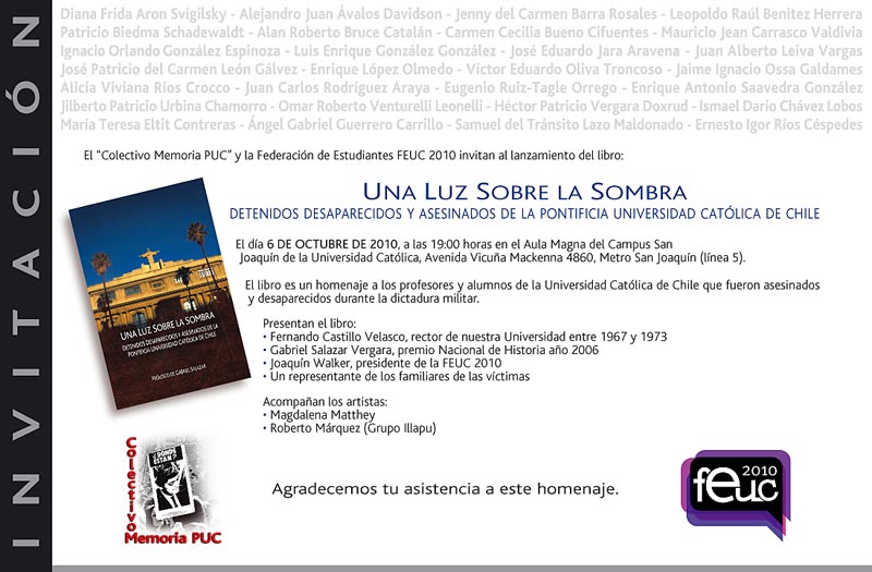 Lanzamiento de libro "Una luz sobre la sombra" sobre Detenidos Desaparecidos y Asesinados de la Universidad Católica (Mierc 6 octubre 19 hrs)