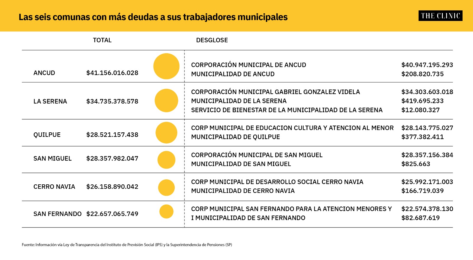 Prácticamente no hay ningún municipio ni corporación municipal del país que no deba cotizaciones previsionales a sus funcionarios. Esa deuda, según cifras oficiales a las que accedió The Clinic, supera los $512 mil millones, y revela que el 98% de las municipalidades del país está al debe. Solo seis comunas concentran el 35% de la deuda total que, además, aumentó explosivamente en los últimos cuatro años. La mayoría de los municipios consultados dijo que las deudas se deben a desfalcos de dineros municipales a costa de las cotizaciones previsionales. Y hay más: The Clinic comprobó que los principales municipios endeudados han seguido recibiendo traspasos desde el Fondo Común Municipal, a pesar de que la ley dice que no pueden hacerlo mientras adeuden cotizaciones a sus trabajadores.