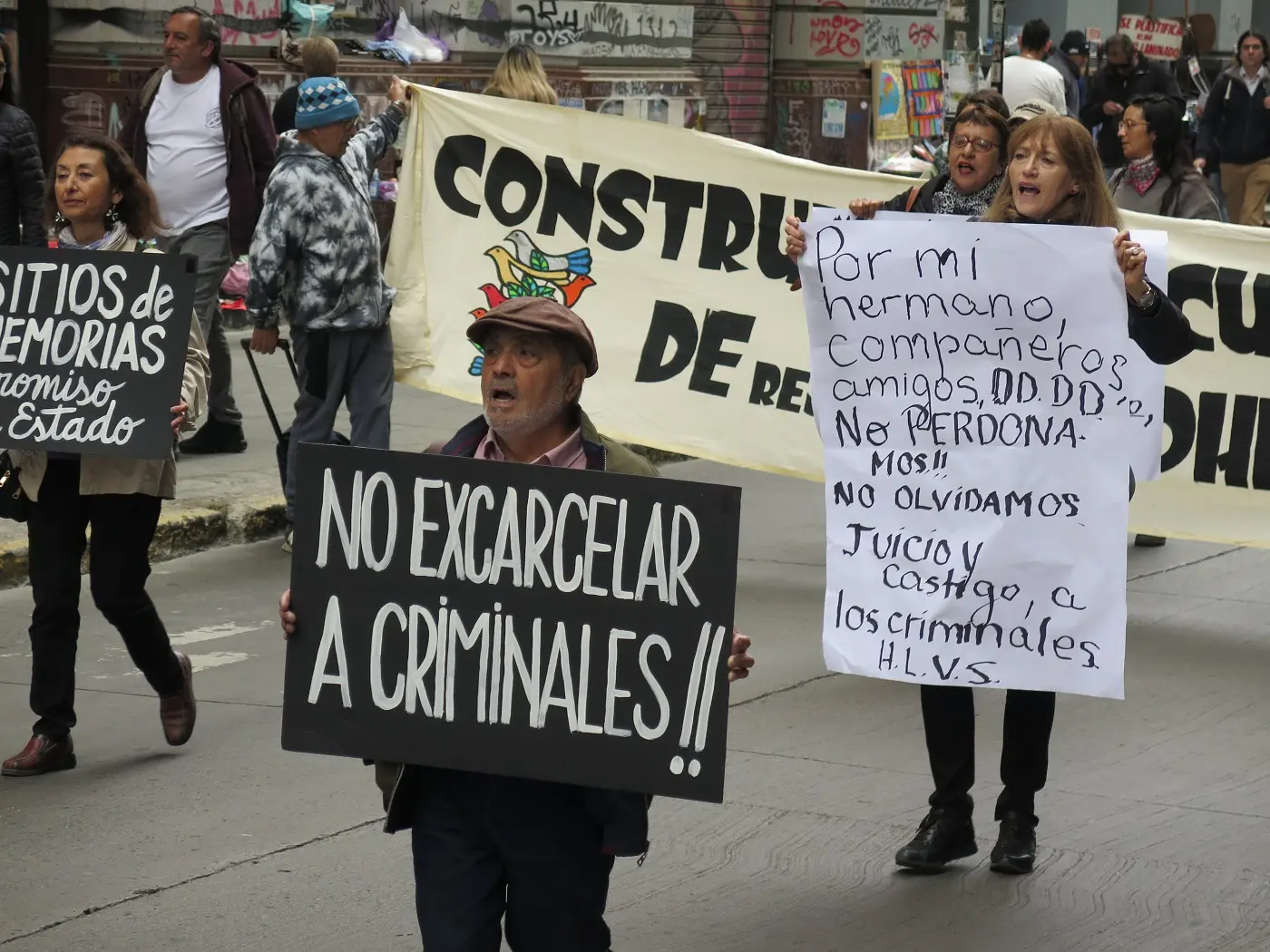 Sobre los lienzos y pancartas que portaban las y los manifestantes se podía leer lo siguiente: “RESTABLECER EQUIPO PLAN DE BÚSQUEDA”; “NO EXCARCELAR A CRIMINALES”; “SITIOS DE MEMORIA COMPROMISO DE ESTADO”; “NO A LA LIBERTAD A LOS CRIMINALES DE PUNTA PEUCO; “POR MI HERMANO, COMPAÑEROS Y AMIGOS DD.DD NO PERDONAMOS, NO OLVIDAMOS, JUICIO Y CASTIGO A LOS CRIMINALES”; “CONSTRUYENDO UNA CULTURA DE RESPETO A LOS DERECHOS HUMANOS”; “VERDAD Y JUSTICIA”.